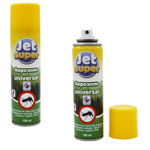 - Тривалий захист: Аерозоль "Jet Super" Universal діє до 4 годин, забезпечуючи безпечний час на свіжому повітрі.