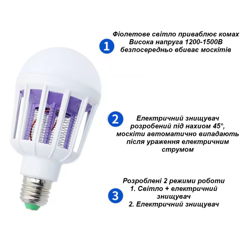 - Світло + електричний знищувач: працює основне біле світло (6500K) та електрична пастка із синім підсвічуванням.