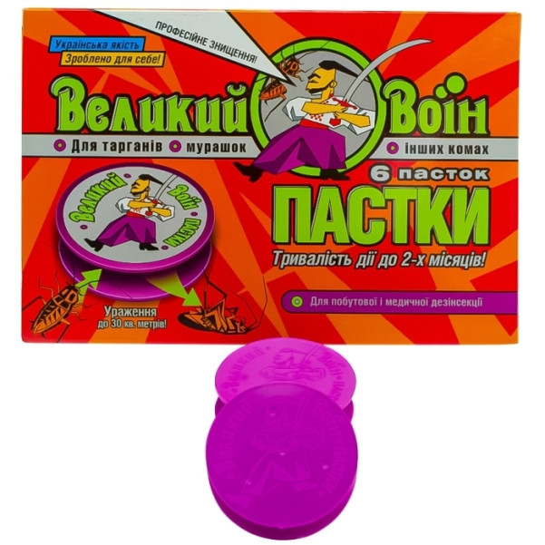 Пастка від тарганів і мурах "Великий Воїн" — це ефективне рішення для боротьби з комахами в будинку. Вона спеціально розроблена для швидкого і надійного усунення тарганів і мурах, забезпечуючи чистоту і безпеку вашого простору. Пастка проста у використанні і не містить шкідливих хімічних речовин, що робить її безпечною для людей і домашніх тварин. В комплекті 6 пасток, які можна розмістити в різних місцях для максимальної ефективності.