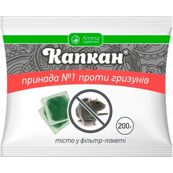 Засіб від гризунів пакетики "Капкан" - це ефективний засіб для боротьби з мишами та щурами. Пакет містить 200 грамів продукту, який швидко та надійно ловить гризунів, забезпечуючи ефективну захист від непрошених гостей.