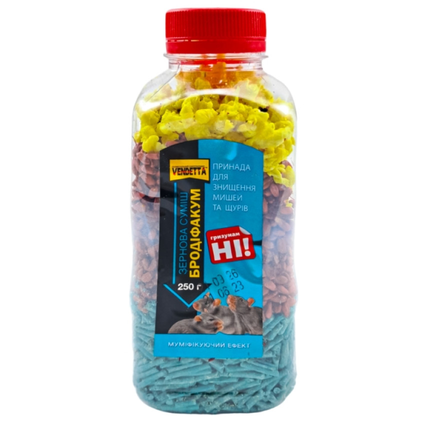 - Ефективність: Зерно "Vendetta" допомагає ефективно боротися з мишами та щурівами, забезпечуючи надійний захист від гризунів.