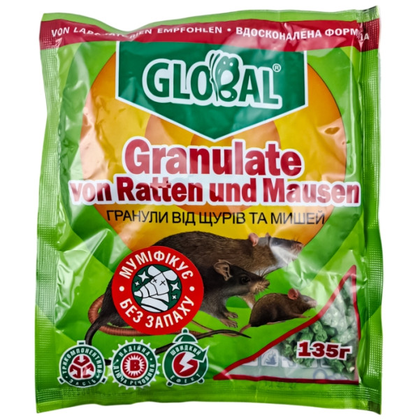 Засіб від мишей та щурів"Global" у формі гранул - це надійний спосіб захистити ваш дім від гризунів. Кожний пакет містить 135 г гранул, які забезпечують ефективний контроль над популяцією мишей та крис, використовуючи метод муміфікації.