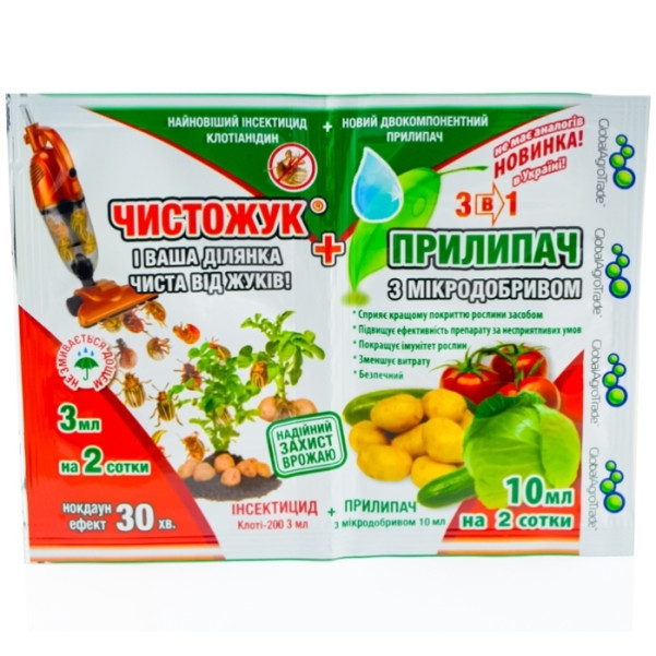 Крім того, Чистожук знищує прихованих шкідників, що живуть навіть у необроблених ділянках та під листям. У комплекті з інсектицидом йде прилипач, який підвищує його ефективність. Прилипач покращує проникнення активної речовини у тканини рослин, долаючи кутикулярний шар. Суміш поверхнево-активних речовин знижує поверхневий натяг робочого розчину, забезпечуючи його рівномірний розподіл по листках і запобігаючи стіканню, що зменшує невиробничі втрати та знижує норму витрати препарату. У складі прилипача також є мікродобриво на основі гуматів калію та кремнію, яке підвищує врожайність, покращує смакові характеристики плодів, зміцнює імунітет рослин та знижує хімічне навантаження від використання засобів захисту рослин.