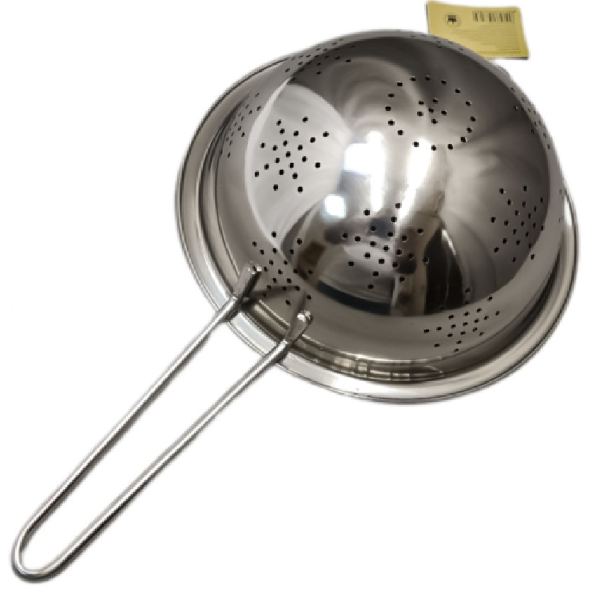 Виготовлений з металу, друшляк має міцну і довговічну конструкцію, яка забезпечує стійкість під час використання. Металічна ручка надійно закріплена до друшляка і забезпечує зручне тримання під час використання.