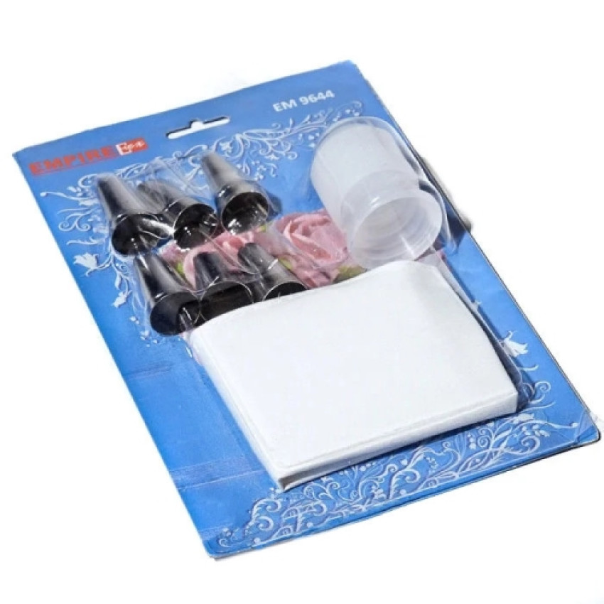 Кондитерський мішок з металевими насадками Empire 9644Комфортну і просту роботу з кремоподібними та іншими масами забезпечує кондитерський мішок з насадками до нього. Він дозволяє легко наповнювати солодощі кремом, прикрашати поверхню випічки, створювати дрібні декоративні елементи. Тому мішок кондитерський з насадками - важлива умова апетитного та красивого зовнішнього вигляду ласощів. Мішок кондитерський з насадками - основні пристрої декоратора кулінарних виробів. За допомогою нього можна швидко, рівно та максимально естетично нанести прикраси на будь-яку поверхню солодощів.