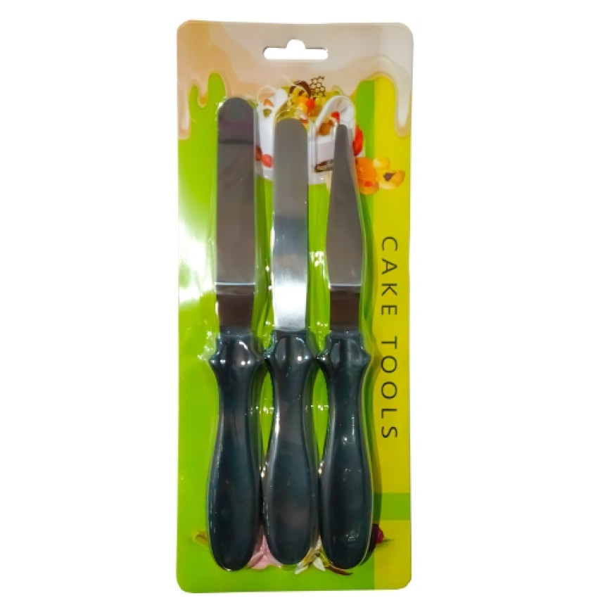 Шпателі кондитерські нержавіючі з чорними ручками L 240 мм (набір 3 шт) 0634 Шпателі використовуються для роботи з дрібними деталями при створенні кондитерських виробів, для нанесення крему дрібними мазками, для роботи з шоколадом, мастикою та марципаном. Шпателі дозволяють створювати велику кількість виробів із мінімальною витратою часу.