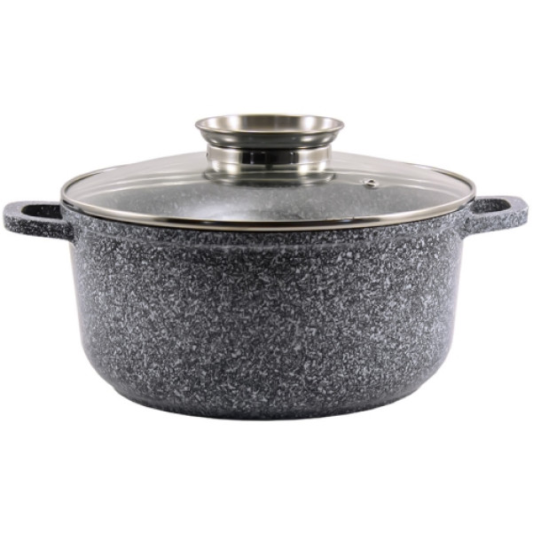 Особливості виробу:Антипригарне двошарове покриття захищає дно каструлі від прилипання частинок їжі.Стильне гранітне оформлення тішить око. Ручки унеможливлюють опіку.Скляна кришка з отвором для виходу пари дозволяє легко контролювати процес.Виріб можна мити у посудомийній машині.