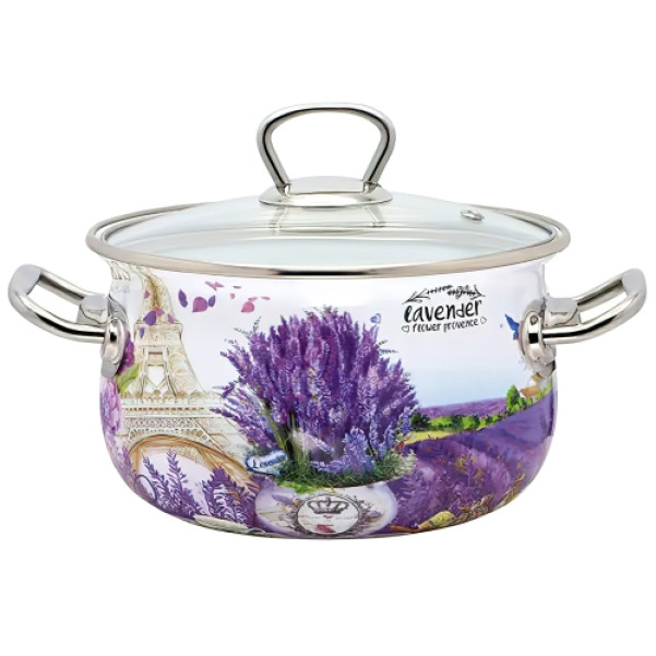 Кастрюля 1,5л емальова з скляною кришкою Лаванда 16707 Interos.Лаванда має об'єм 1,5 л і поставляється з кришкою. Ця емальована каструля відноситься до високого класу і користується стабільним попитом в Україні - її можна купити для домашньої кухні, ресторану, кафе, їдальні. Посуд Interos поєднує в собі практичність, зручність експлуатації та привабливий дизайн. Каструля «Лаванда» прикрашена стильним зображенням кольорів, що робить її ще й оригінальним елементом інтер'єру на кухні.