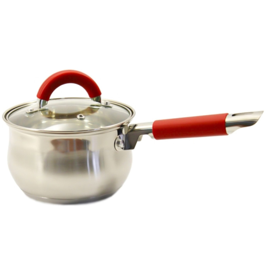 Ківш із нержавіючої сталі та скланою кришкою 1,3л (червоні ручки)