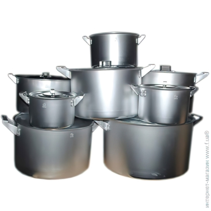 Набір алюмінієвих циліндричних каструль 8-предметний з об'ємами 2,5л, 3,5л, 4,5л, 6,0л, 8,0л, 10л, 15л і 20л - це розширений комплект посуду, який забезпечить вам усе необхідне для готування різноманітних страв.