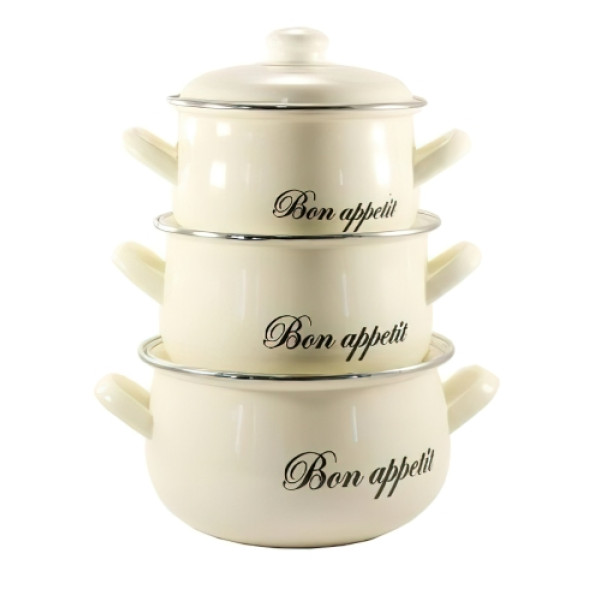 Набір емальованих каструль 3шт зі скляною кришкою Bon Appetit Кремовий