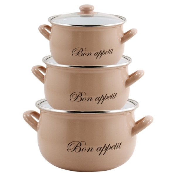 Набір емальованих каструль Bon Appetit складається з трьох предметів і має зручні скляні кришки. Цей набір призначений для забезпечення вам зручності та задоволення під час приготування їжі.