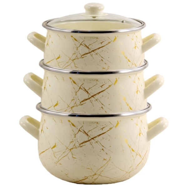 Набір емальованих каструль Білий Мармур 701 складається з трьох предметів і має стильний дизайн, який надає каструлям елегантний вигляд. Цей набір створений, щоб забезпечити вам зручність і задоволення в процесі приготування їжі.