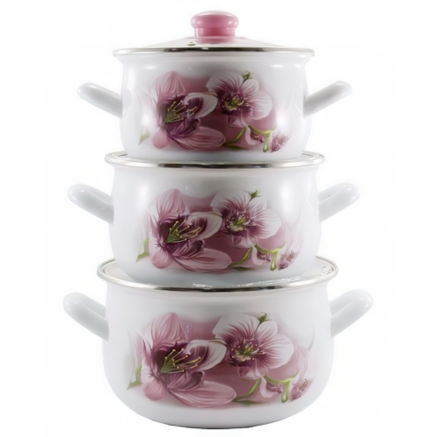 Набір емальованих кастрюль 3шт Орхідея рожева