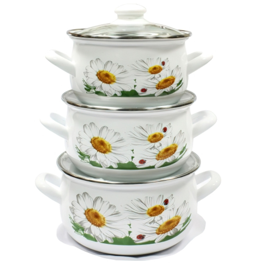 Набір каструль з кришками виготовлений із сталі з емалевим покриттям з обох сторін.