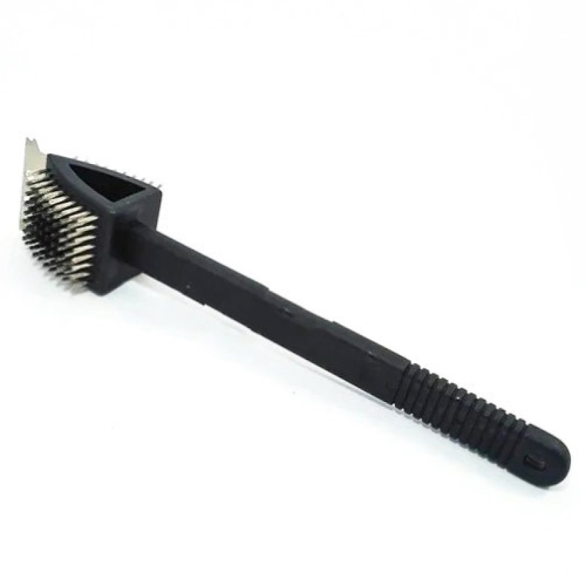 Щітка для чищення грилі або барбекю з жорсткою двосторонньою металевою щетиною на робочій поверхні. Виготовлена з нержавіючої сталі з обробленою пластиком ручкою.