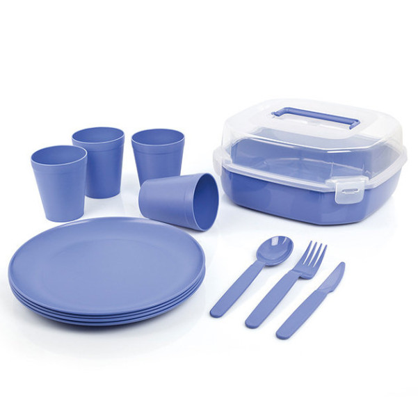 Набір для пікніка на 4 персон складається з: 4 шт - тарілки плоскі , 4 шт-склянки,комплектуючі набору складаються у зручний контейнер для зберігання, на наборі для пікніка є ручка та клямки для зручного використання. Має компактний розмір та стильний дизайн. Сам контейнер також можна використовуватиме зберігання продуктів харчування. Ідеально підходить для улюблених обідів із собою.
