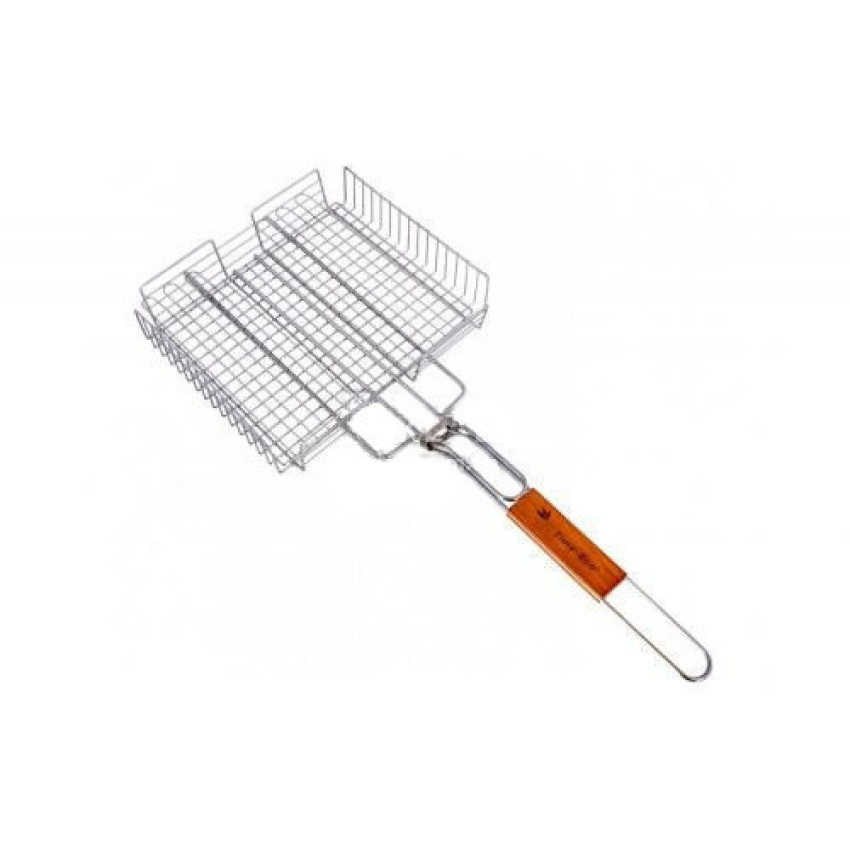 Решітка металева з деревяною ручкою для барбекю 35*46*1 1,5мм HF-022 Interos.Решітка для барбекю - це однакові сітки з дроту, сполучені між собою. Для зручності і безпеки решітка доповнено ручками: довга ручка робиться з дерев'яною основою, для зручності кухаря, а друга ручка, менша за розміром, з'єднується з більшою за допомогою металевого кільця. Продукти затискаються між гратами і рівномірно пропікаються.