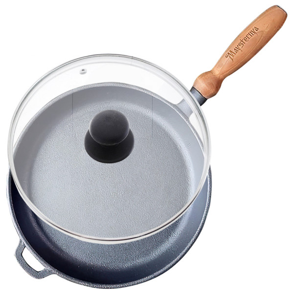 - Завдяки зручній дерев'яній ручці сковорода легко тримається в руці, що робить процес готування більш приємним та безпечним, запобігаючи опікам.