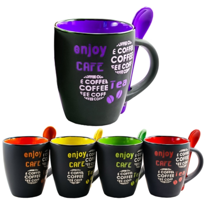 Кружка має стильний дизайн з написом Enjoy Coffee і малюнком кавових зерен, що додає їй особливої привабливості і надає вашому кавовому досвіду особливого шарму. В наборі також є керамічна ложка, яка зручно розташовується на ручці кружки і дозволяє вам зручно смакувати свій улюблений напій.