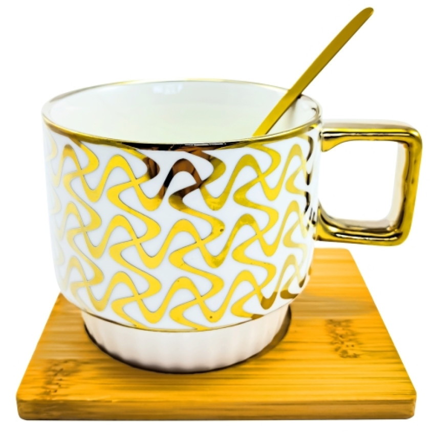 Чашка Мозаїка Золото 330мл на бамбуковій підставці з ложкою