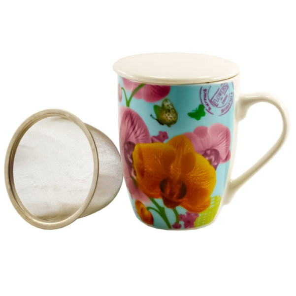 Фарфорова кружка об'ємом 330 мл, що має циліндричну форму, кришку і металеве сито, є гарним варіантом для насолоди гарячими чи холодними напоями. Цей тип кружки зазвичай використовується для чаю або інших напоїв, які потребують фільтрування.