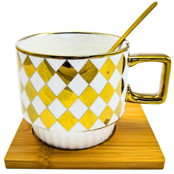 Чашка Ромб Золото 330мл на бамбуковій підставці з ложкою