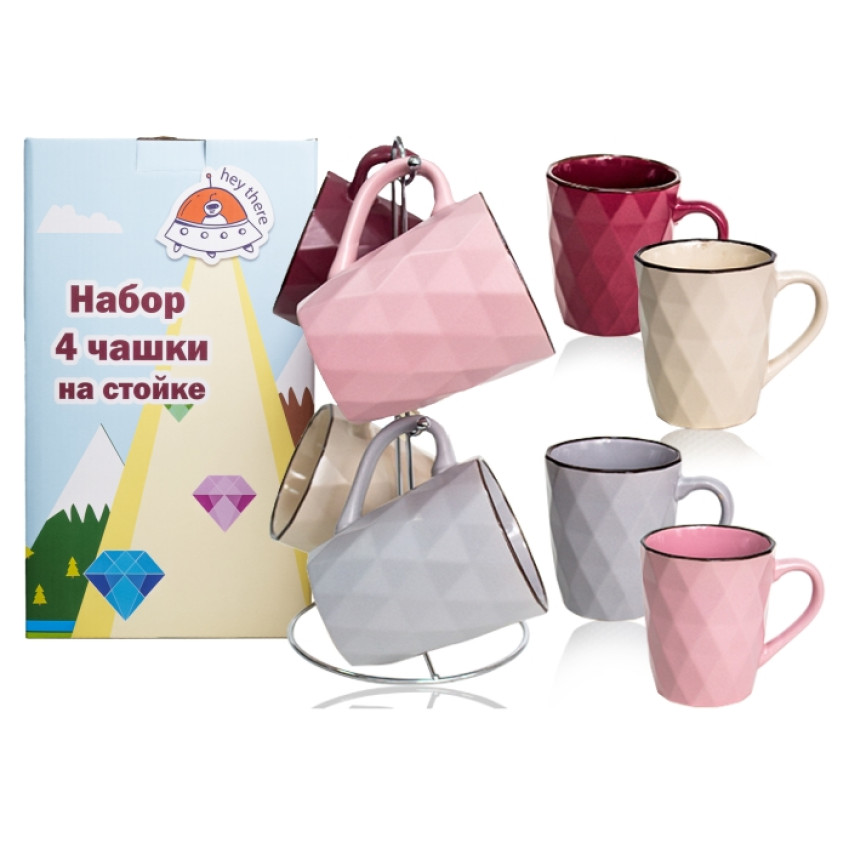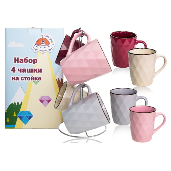 Цей стильний чайний набір "Грані" стане чудовим доповненням до будь-якої кухні. Виготовлений з високоякісної кераміки, набір включає чотири чашки об'ємом 350 мл кожна, що ідеально підходять для чаювання з родиною або друзями. Чашки зручно розташовані на елегантній стійці, що забезпечує їх компактне зберігання і легкий доступ.