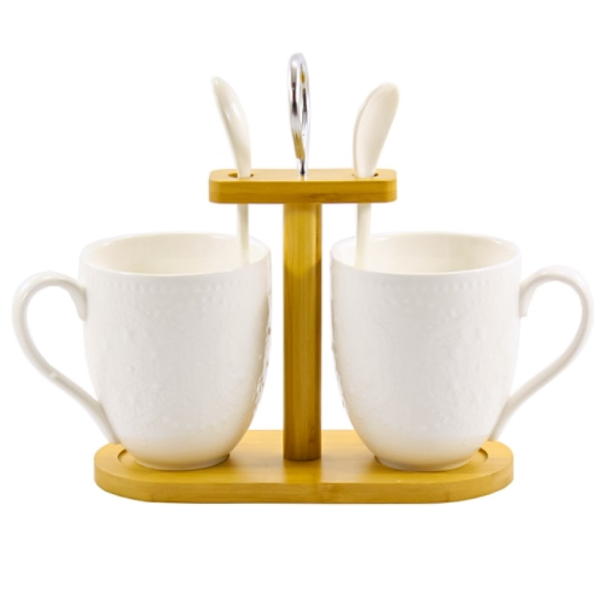 Набір порцелянових чашок з ложками на дерев'яній стійці 2-предмета