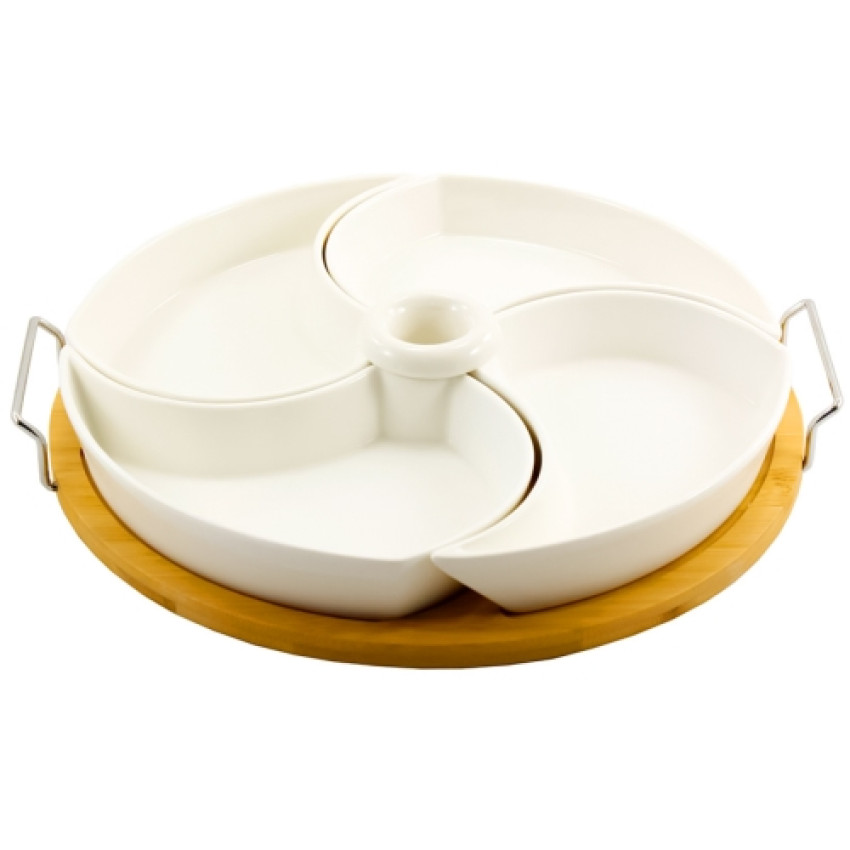Менажниця 4-секційна розміром 28см на дерев'яній підставці - це стильний і практичний аксесуар для сервірування різноманітних страв і закусок. Вона додасть елегантності і організованості до вашого столу та дозволить зручно подати різні страви вашим гостям.