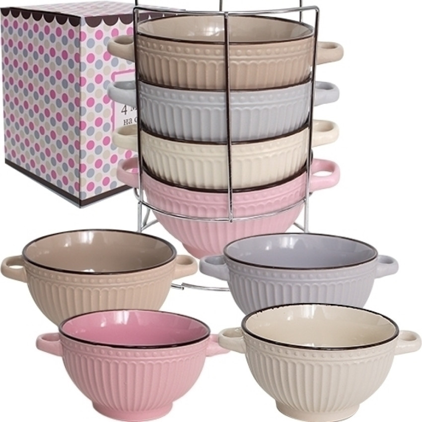 Набір мисок на металевій підставці з високоякісної кераміки. У набір входить 4 миски об'ємом 680 мл і хромована підставка.