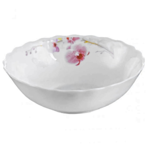 Салатник має круглу форму і прикрашений хвилястим краєм, що надає йому додаткового обсягу та привабливості. Дизайн салатника відтворює малюнок орхідеї на білому тлі, створюючи враження ніжності і витонченості.