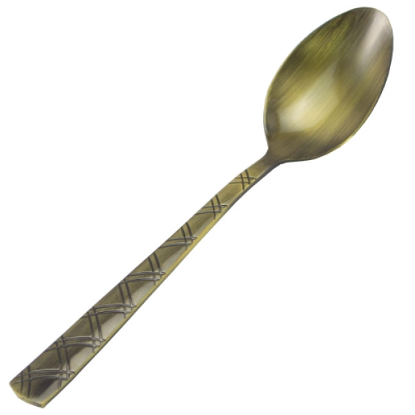 Ця столова ложка має стильний дизайн з ромбовими мотивами на рукоятці, що надає їй унікальний вигляд. Вона виготовлена з високоякісної нержавіючої сталі з бронзовим покриттям, що забезпечує їй міцність, довговічність і естетичний вигляд.