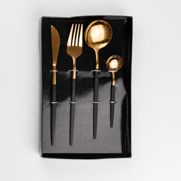 Набір столових приборів на 1 персону у чорномукольорі - це сучасний та елегантний набір, який ідеально підійде для будь-якого заходу. Він складається з чотирьох предметів: столової ложки, столової вилки, чайної ложки та столового ножа. Виготовлені з високоякісної нержавіючої сталі, вони мають чорну обробку, яка забезпечує міцність та стійкість до корозії. Крім того, їх блискуча полірована поверхня додає нотки елегантності. Ці прибори безпечно мити у посудомийній машині, що забезпечує легке очищення та догляд за ними.
