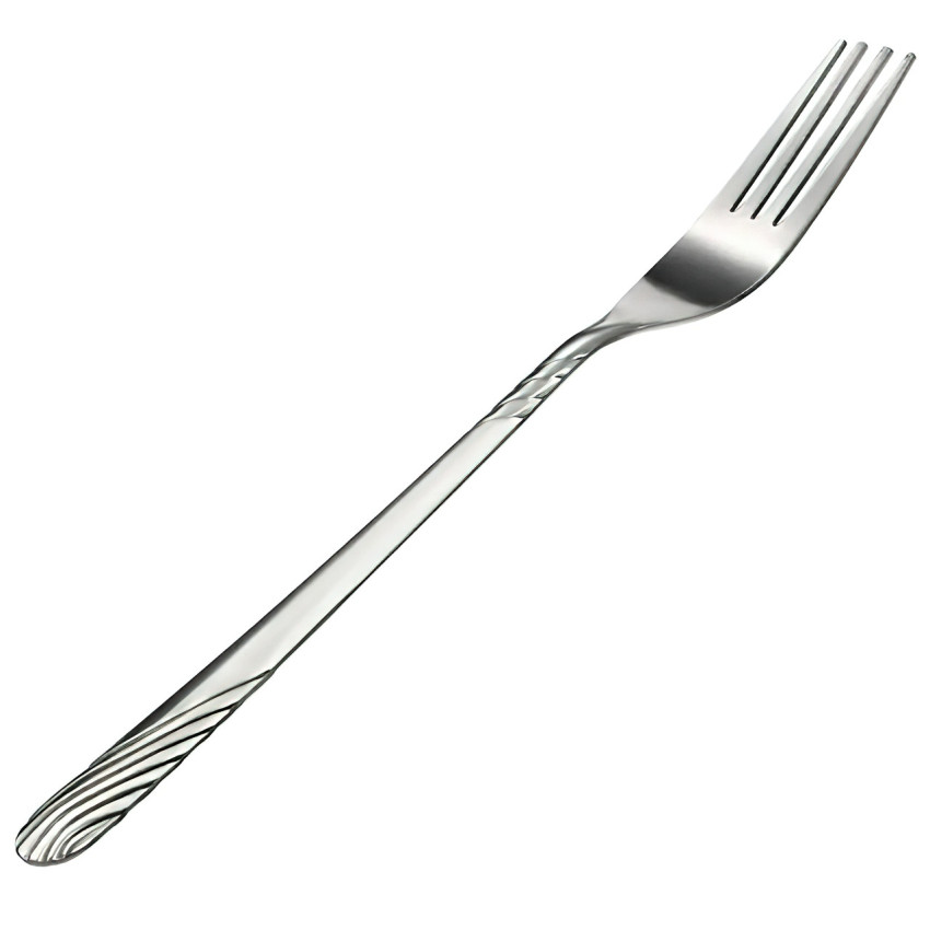 Ця столова виделка має сучасний дизайн зі змішаним візерунком смуг на рукоятці. Вона виготовлена з високоякісної нержавіючої сталі, що забезпечує їй міцність та довговічність. Гладка поверхня і зручна форма рукоятки роблять її приємною у використанні.
