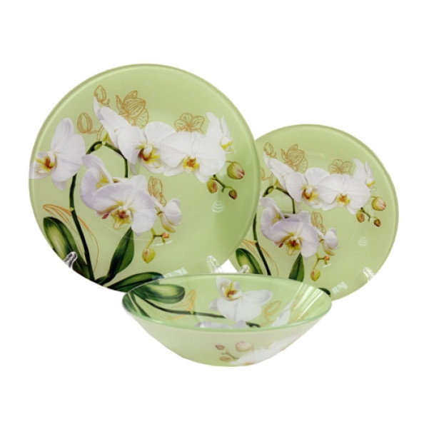 Набір 18 тарілок класичної круглої форми. Тарілки виготовлені зі склокераміки з підвищеною удароміцністю. Набір забезпечує сервіровку на 9 персон при подачі десертів, порційно нарізаного хліба та булочок, а також других страв. Можна використовувати в мікрохвильовій печі для розігріву і мити в посудомийній машині.
