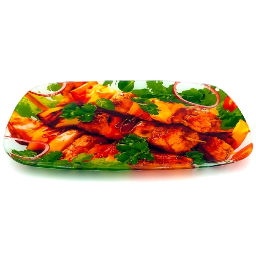 Блюдо прямокутної форми з декорованого скла зі згладженими краями., з малюнками Шашлик Петрушка.