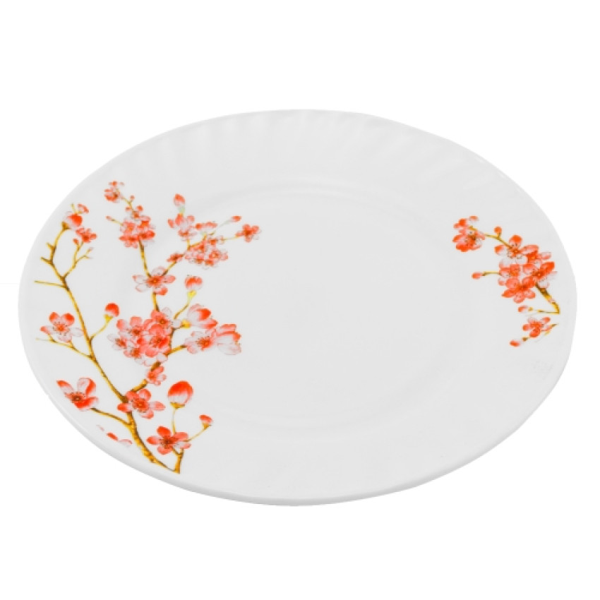 Тарілка дрібна Сакура "Interos". Дрібні столові, вони ж обідні, тарілки призначені для подачі головного гарячого страви, іноді їх також використовують як підставочний до глибоких і закусочних тарілках. Тарілка виготовлена з високоякісної кераміки, має високу міцність, стійкість до відколів і подряпин. Матеріал: склокераміка. Форма: кругла. Колір: білий.Дизайн: квіти.