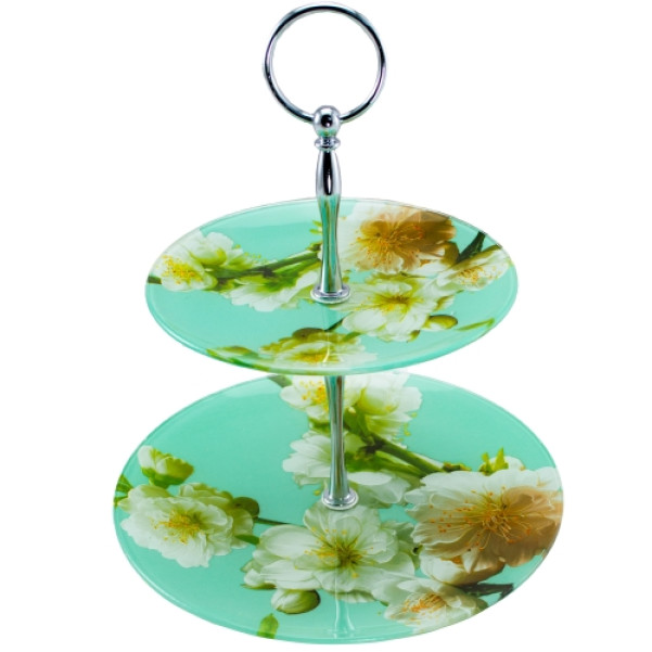 Фруктовниця скляна кругла 2 яруси Яблуня бірюзова