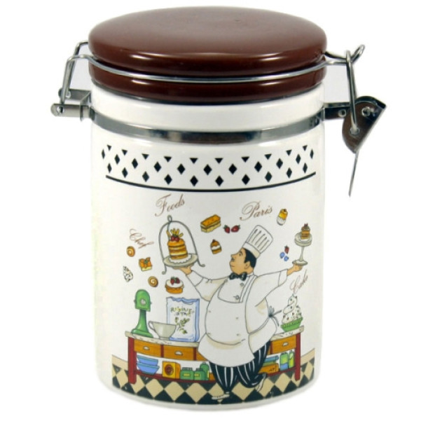 Банка з замком Interos Кухар виготовлена з кераміки, має кришку на затяжках. Кришка забезпечує герметичність завдяки силіконовим проставкам на краях. Призначена для зберігання крупи, варення, меду, горіхів, макаронів. Продукти не втратять свій аромат і не будуть сиріти. Доломіт є полегшеною керамікою. Банка для сипучих продуктів покрита білою глянцевою глазур'ю. Замок-фіксатор зроблений з хромованої нержавіючої сталі. Поставляється в презентаційній подарунковій упаковці.