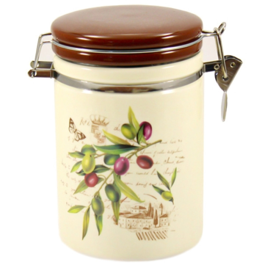 Банка з замком Interos Оливки виготовлена з кераміки, має кришку на затяжках. Кришка забезпечує герметичність завдяки силіконовим проставкам на краях. Призначена для зберігання крупи, варення, меду, горіхів, макаронів. Продукти не втратять свій аромат і не будуть сиріти. Доломіт є полегшеною керамікою. Банка для сипучих продуктів покрита білою глянцевою глазур'ю. Замок-фіксатор зроблений з хромованої нержавіючої сталі. Поставляється в презентаційній подарунковій упаковці.