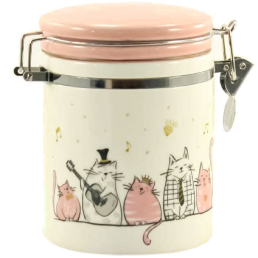 Банка з замком Interos Співаючі Котики виготовлена з кераміки, має кришку на затяжках. Кришка забезпечує герметичність завдяки силіконовим проставкам на краях. Призначена для зберігання крупи, варення, меду, горіхів, макаронів. Продукти не втратять свій аромат і не будуть сиріти. Доломіт є полегшеною керамікою. Банка для сипучих продуктів покрита білою глянцевою глазур'ю. Замок-фіксатор зроблений з хромованої нержавіючої сталі. Поставляється в презентаційній подарунковій упаковці.