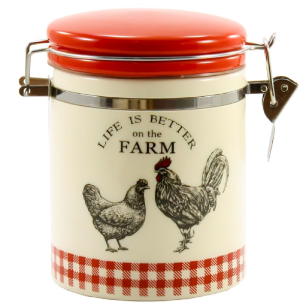 Банка з замком Interos Ферма виготовлена з кераміки, має кришку на затяжках. Кришка забезпечує герметичність завдяки силіконовим проставкам на краях. Призначена для зберігання крупи, варення, меду, горіхів, макаронів. Продукти не втратять свій аромат і не будуть сиріти. Доломіт є полегшеною керамікою. Банка для сипучих продуктів покрита білою глянцевою глазур'ю. Замок-фіксатор зроблений з хромованої нержавіючої сталі. Поставляється в презентаційній подарунковій упаковці.