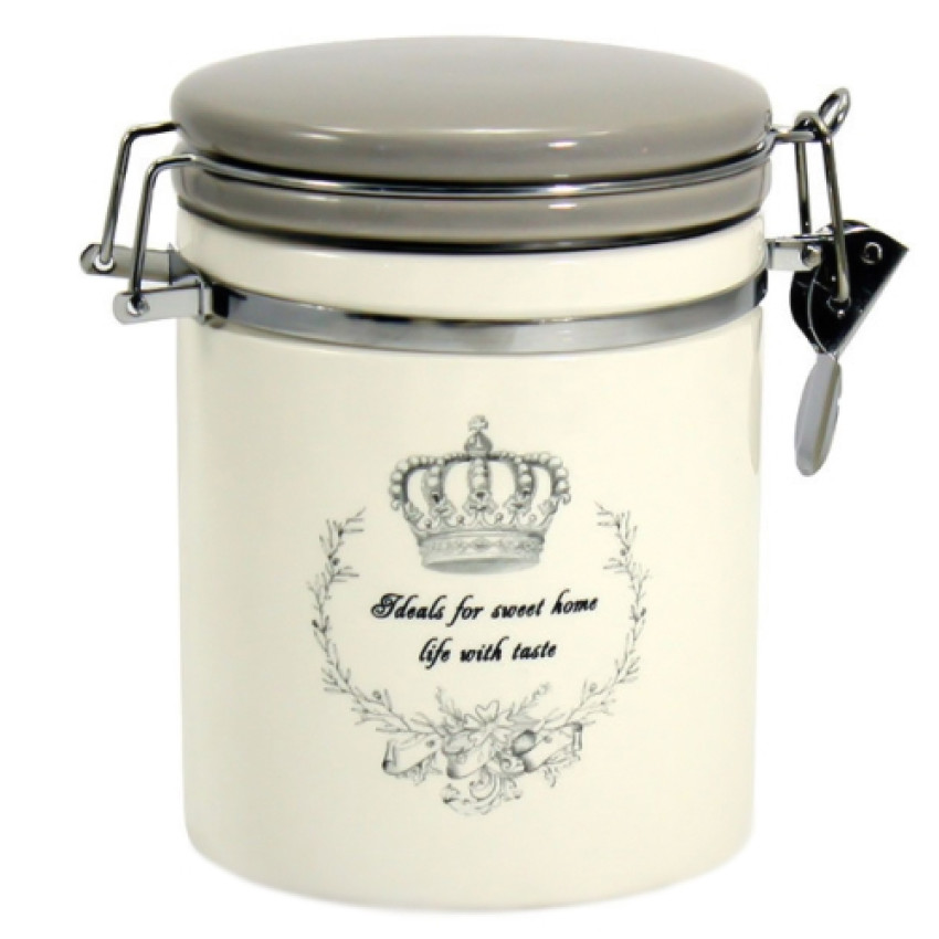 Банка з замком Interos Корона виготовлена з кераміки, має кришку на затяжках. Кришка забезпечує герметичність завдяки силіконовим проставкам на краях. Призначена для зберігання крупи, варення, меду, горіхів, макаронів. Продукти не втратять свій аромат і не будуть сиріти. Доломіт є полегшеною керамікою. Банка для сипучих продуктів покрита білою глянцевою глазур'ю. Замок-фіксатор зроблений з хромованої нержавіючої сталі. Поставляється в презентаційній подарунковій упаковці.