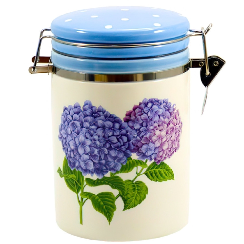 Банка з замком Interos Гортензія виготовлена з кераміки, має кришку на затяжках. Кришка забезпечує герметичність завдяки силіконовим проставкам на краях. Призначена для зберігання крупи, варення, меду, горіхів, макаронів. Продукти не втратять свій аромат і не будуть сиріти. Доломіт є полегшеною керамікою. Банка для сипучих продуктів покрита білою глянцевою глазур'ю. Замок-фіксатор зроблений з хромованої нержавіючої сталі. Поставляється в презентаційній подарунковій упаковці.