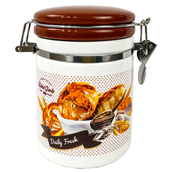 Банка з замком Interos Хліб виготовлена з кераміки, має кришку на затяжках. Кришка забезпечує герметичність завдяки силіконовим проставкам на краях. Призначена для зберігання крупи, варення, меду, горіхів, макаронів. Продукти не втратять свій аромат і не будуть сиріти. Доломіт є полегшеною керамікою. Банка для сипучих продуктів покрита білою глянцевою глазур'ю. Замок-фіксатор зроблений з хромованої нержавіючої сталі. Поставляється в презентаційній подарунковій упаковці.