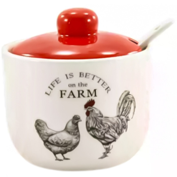Цукорниця 350 мл Interos Ферма - виготовлена з кераміки. Призначений для зберігання цукру, також для інших сипучих. Виконана з якісної кераміки, стійка до впливу зовнішнього середовища, не вбирає запахи. Зручна і проста у догляді, позику гідне місце на вашій кухні завдяки елегантному дизайну і високій якості. Дуже красиво буде виглядати при сервіруванні столу під час чаювання. Цукорниця керамічна з ложкою - упакована фірмову коробку, завдяки чому підійде в якості подарунка.