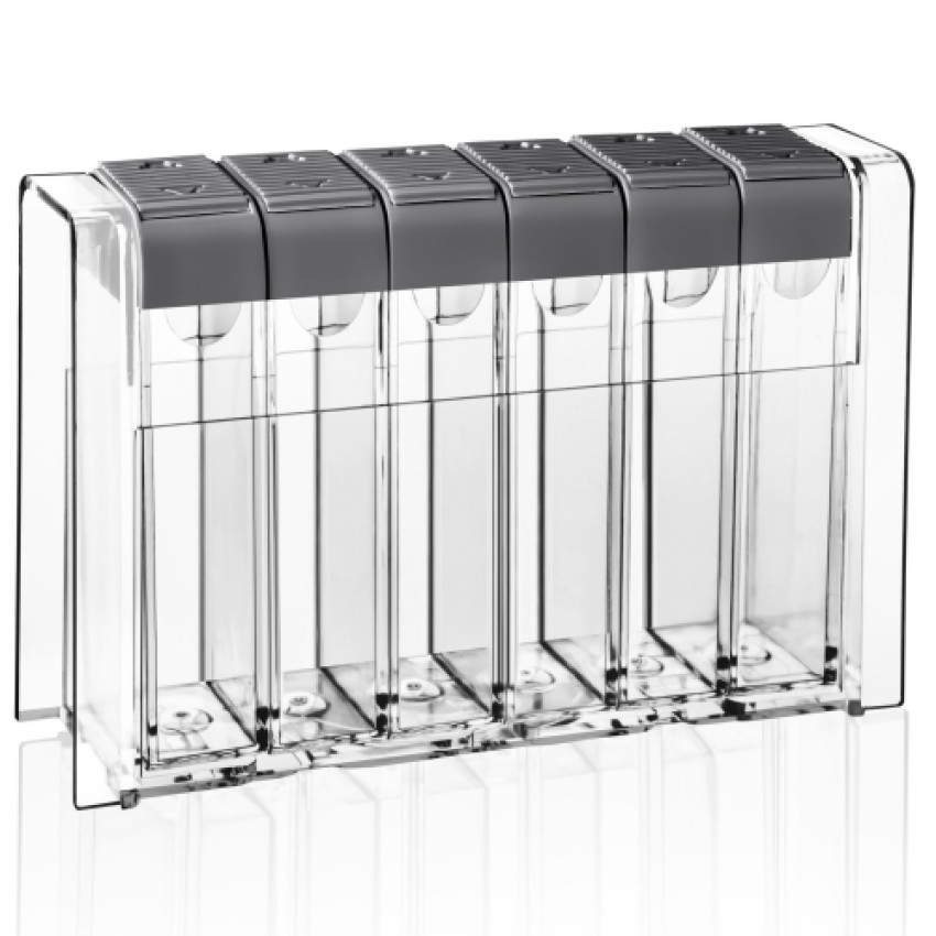 Набір з шести герметичних ємностей. Виконаний у вигляді прямокутних, вертикальних, пластикових ємностей. Призначений для зручного зберігання спецій. В набір входить 6 міні - контейнерів - поміщені в органайзер. Ємності містять щільні кришки, що дозволяє довгостроково зберігати продукти.
