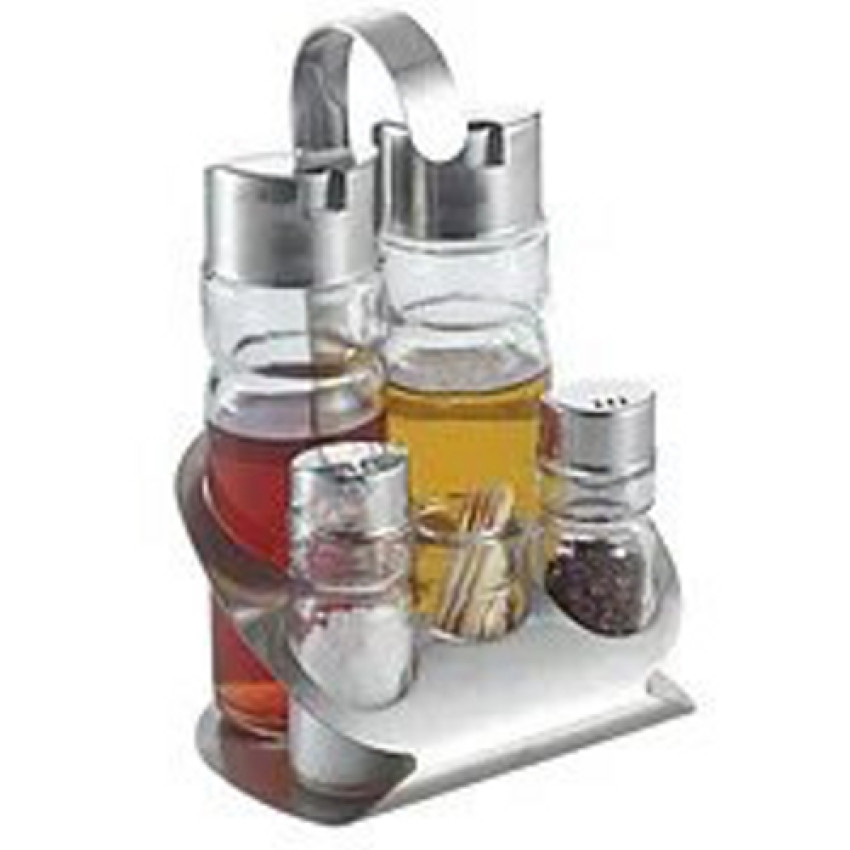 Сучасно оформлений набір для спецій Empire 9595 виготовлено з безпечних, міцних матеріалів. Набір ідеально підходить для зберігання і подачі до столу різних спецій і популярних заправок до основних страв. Склад набору: всього предметів 7шт.; сільничка; перечниця; ємність для зубочисток; баночка для оцту; баночка для масла; підставка.