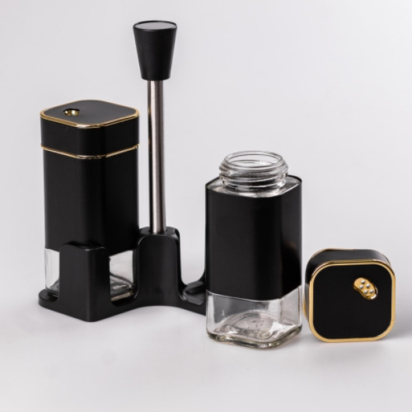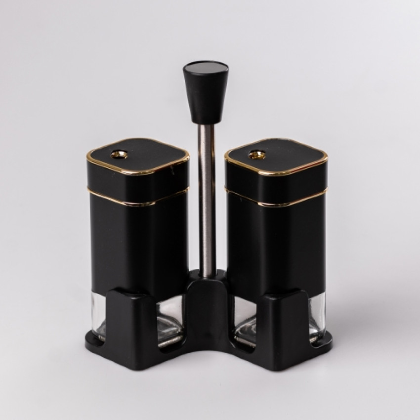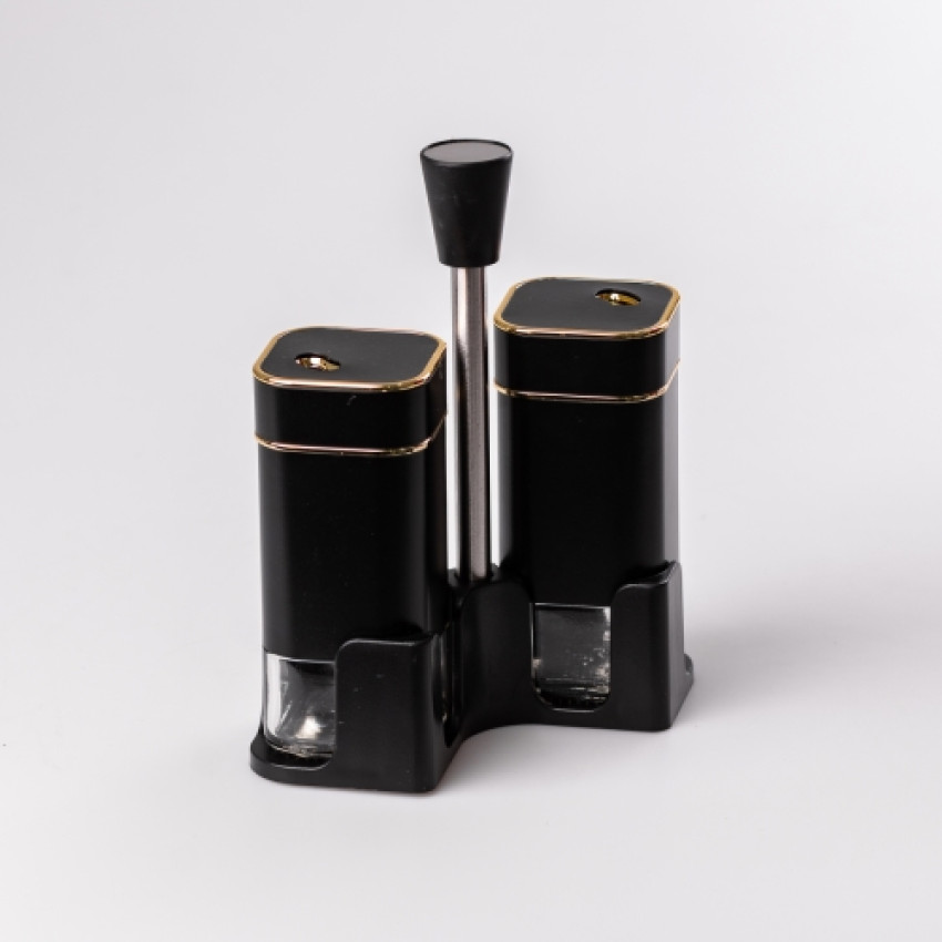 Цей набір включає два елегантних контейнери для спецій, розташованих на ергономічній підставці. Кожен контейнер оптимально підходить для зберігання різних спецій, трав та приправ, надаючи вашим стравам неповторний смак та аромат.
